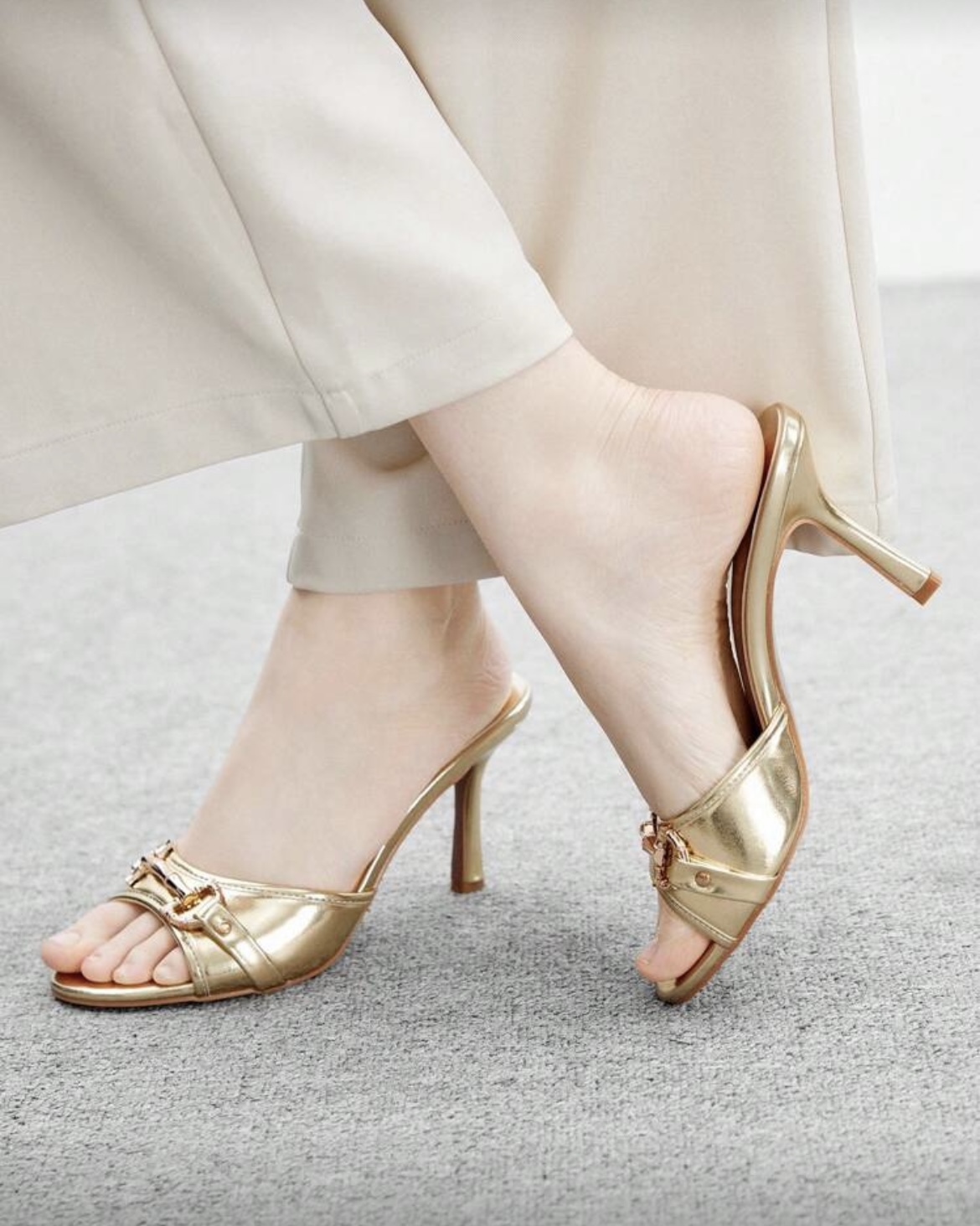 Estos mules dorados no son solo para fiestas. Si bien son el compañero ideal para un vestido de gala, cóctel o una boda, su versatilidad te sorprenderá. Llévalos con un traje sastre blanco para un look power dressing inolvidable, o con jeans oscuros y un blazer para una cena elegante. La punta abierta y el diseño minimalista en su estructura permiten que el pie respire, mientras que la plantilla ligeramente acolchada asegura que puedas disfrutar de tu evento sin sacrificar el confort.