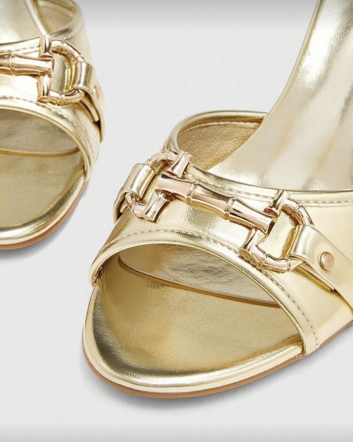 Elaborados con una silueta mule (destalonados), estos zapatos combinan la comodidad de un diseño fácil de poner (slip-on) con la sofisticación de un tacón alto fino que estiliza la pierna al instante. El detalle que eleva el diseño a otro nivel es la hebilla metálica dorada sobre el empeine. Este aplique, de inspiración horsebit con detalles que simulan bambú, añade un toque de diseño exclusivo y una textura que rompe la uniformidad del acabado metalizado, reflejando un gusto por los detalles de lujo.
