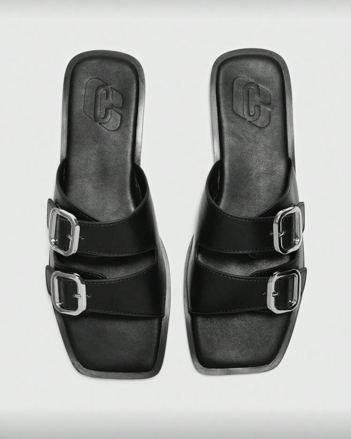 El elemento central del diseño son sus dos correas anchas, cada una adornada con una prominente hebilla plateada de acabado mate. Estas hebillas no solo son un detalle estético de alto impacto que rompe la monotonía del negro, sino que también son completamente funcionales, permitiéndote ajustar la sandalia para un calce perfecto y personalizado. Este detalle utility contrasta elegantemente con la silueta limpia y depurada del zapato.