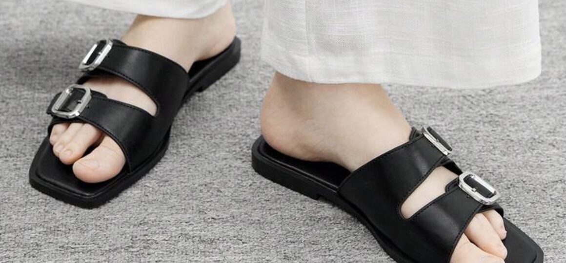 Siguiendo las últimas pasarelas, estas sandalias planas para mujer cuentan con una distintiva punta cuadrada. Esta forma geométrica aporta un toque arquitectónico y contemporáneo, diferenciándolas de las sandalias redondeadas tradicionales. Están fabricadas en un material de alta calidad (o “cuero vegano”) en un profundo color negro que combina absolutamente con todo. La plantilla ergonómica y la suela plana de goma están diseñadas para ofrecer confort durante todo el día, permitiéndote moverte con libertad y confianza.