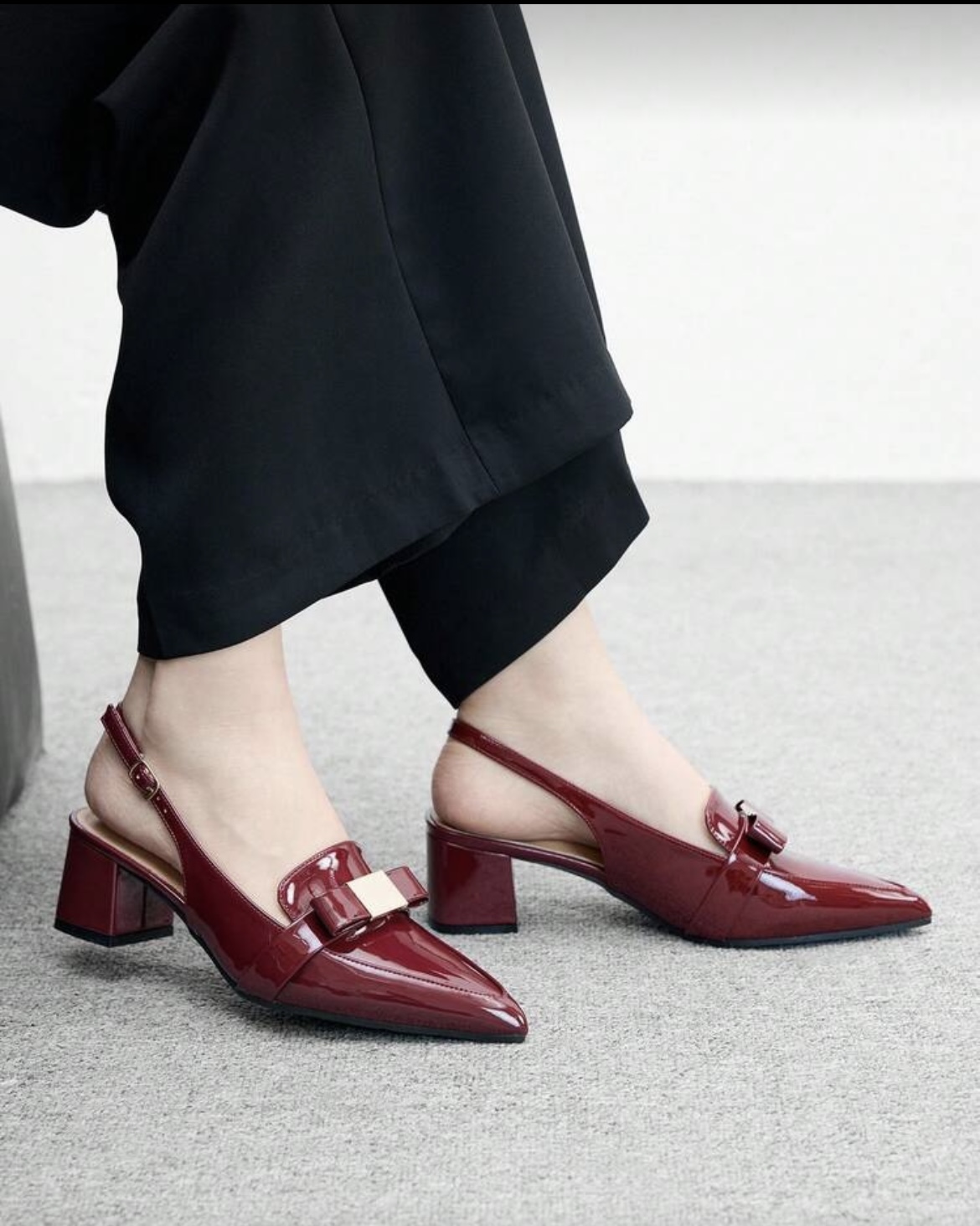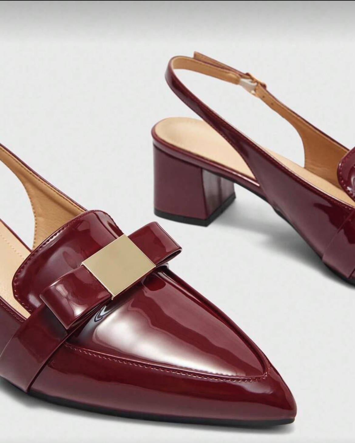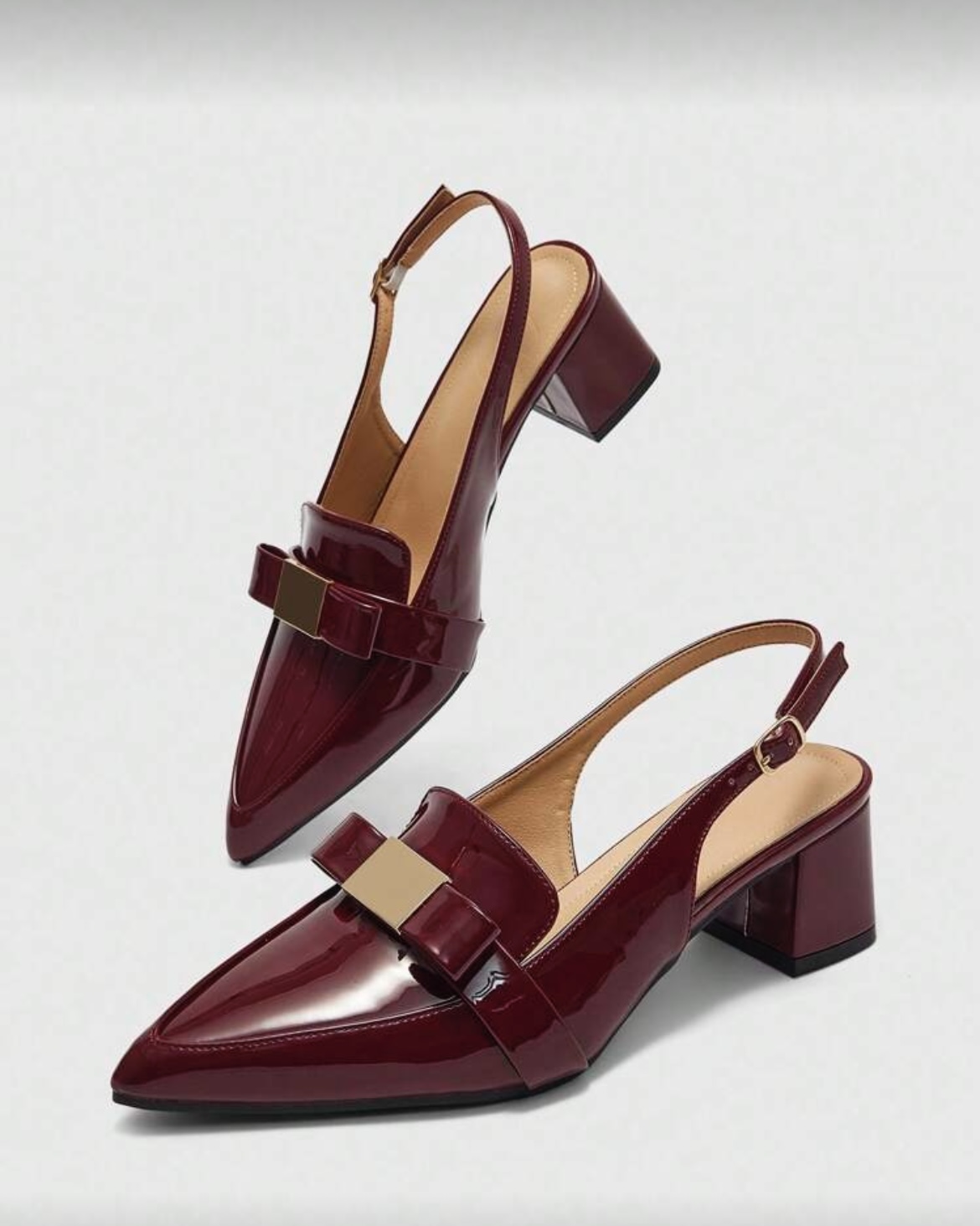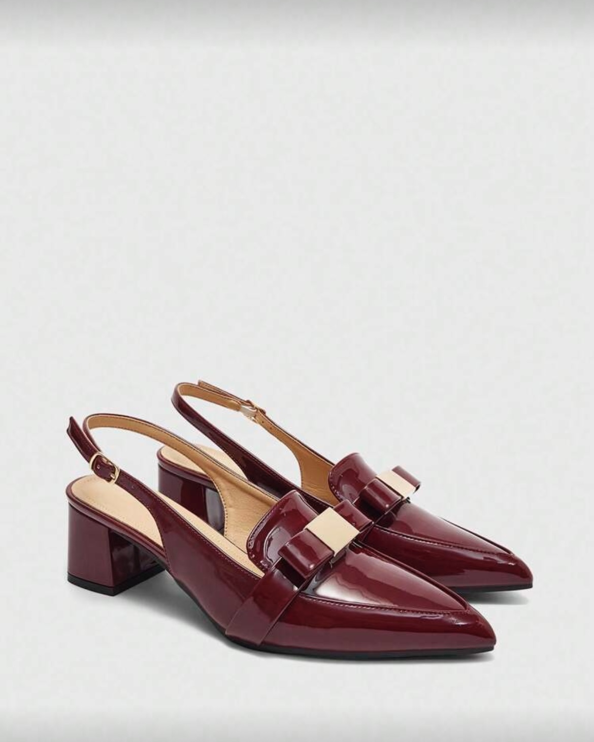 Descubre tus nuevos zapatos de charol bordó favoritos. Este elegante par es la definición de office chic, diseñado para la mujer moderna. Presenta un sofisticado diseño slingback (destalonado) con una elegante punta fina que estiliza la figura. El detalle de lazo con aplique metálico dorado añade un toque de distinción, mientras que el cómodo tacón bloque de altura media te da estabilidad para todo el día. Perfectos para la oficina o un evento, estos zapatos elegantes de mujer en color vino son una inversión en estilo atemporal.